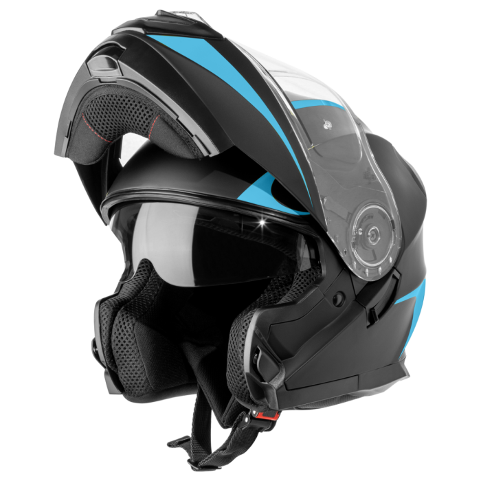 Van deze flip-up helm kan het kinstuk naar boven worden geklapt. Hierdoor kun je even makkelijk praten of de wind over je gezicht laten gaan. Dit doe je door de knop onder het kinstuk in te drukken en en het kinstuk omhoog te klappen.